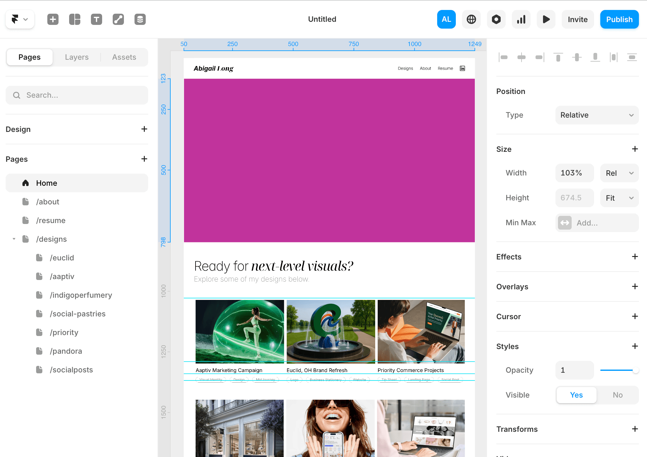 Last year, I redesigned my portfolio in Readymag, a no-code website builder marketed toward creatives. I enjoyed trying the platform, but when it came time to update my site after my Walker Sands internship, I realized it didn’t give me the flexibility I needed to bring my ideas to life.