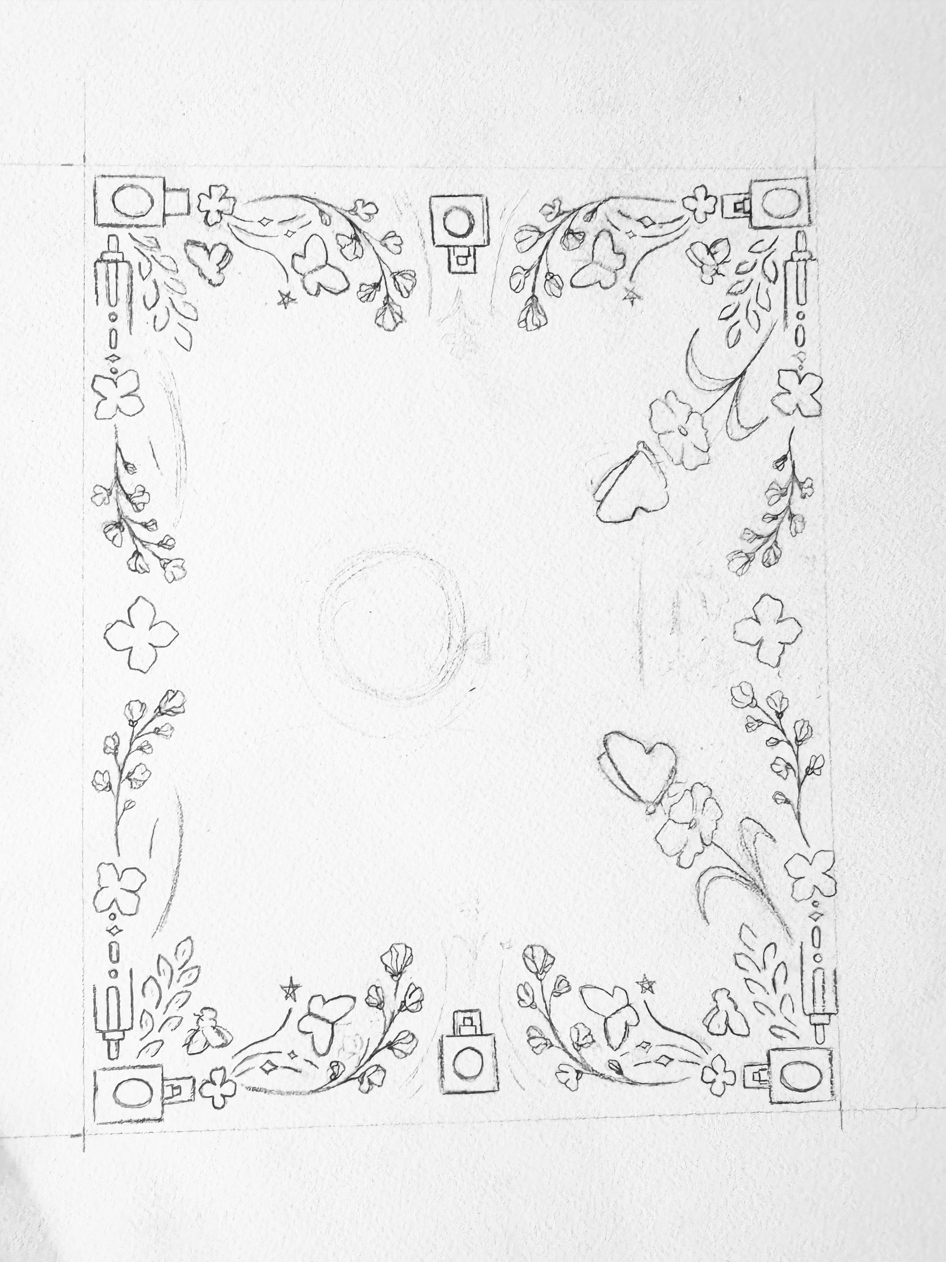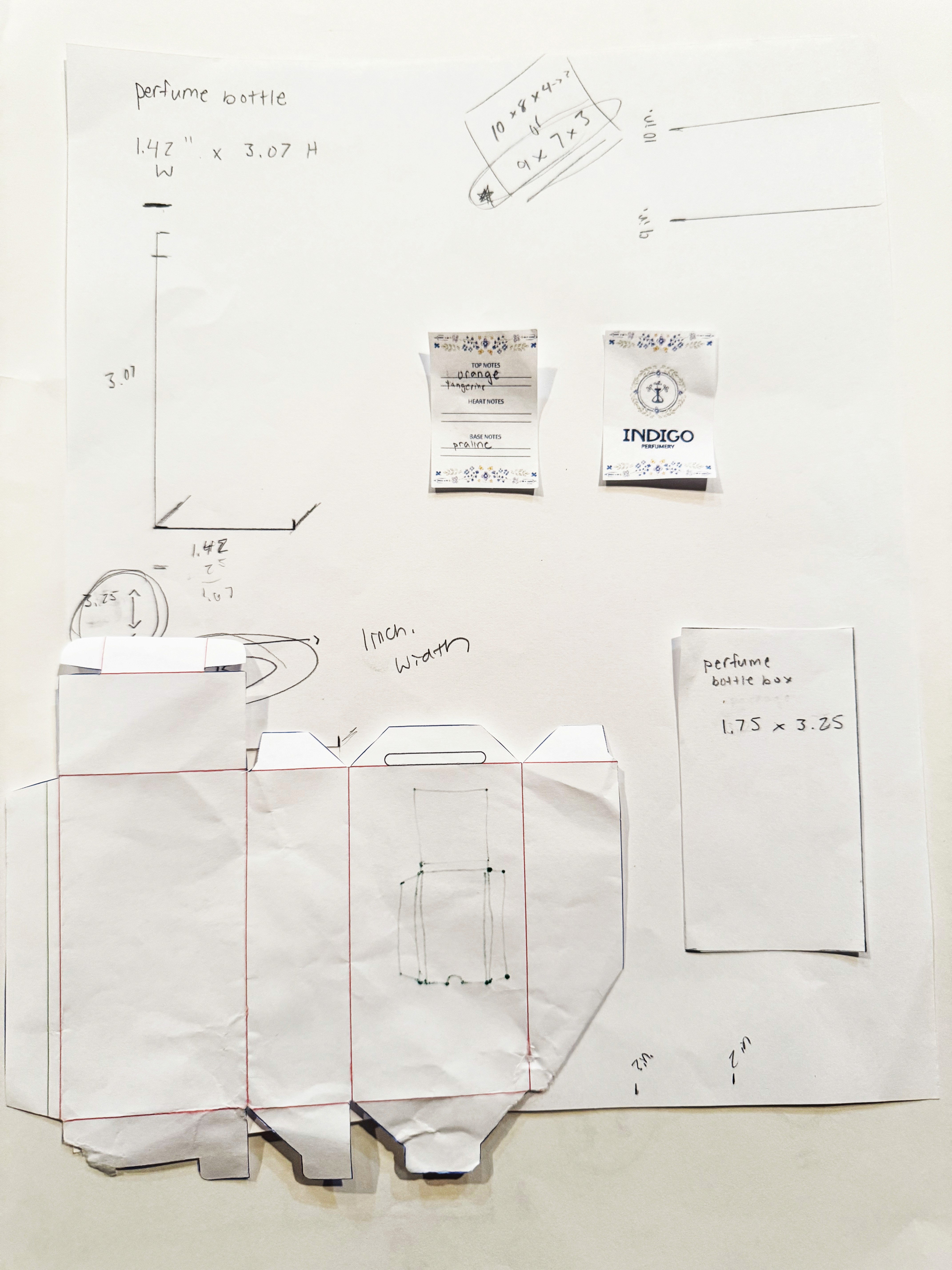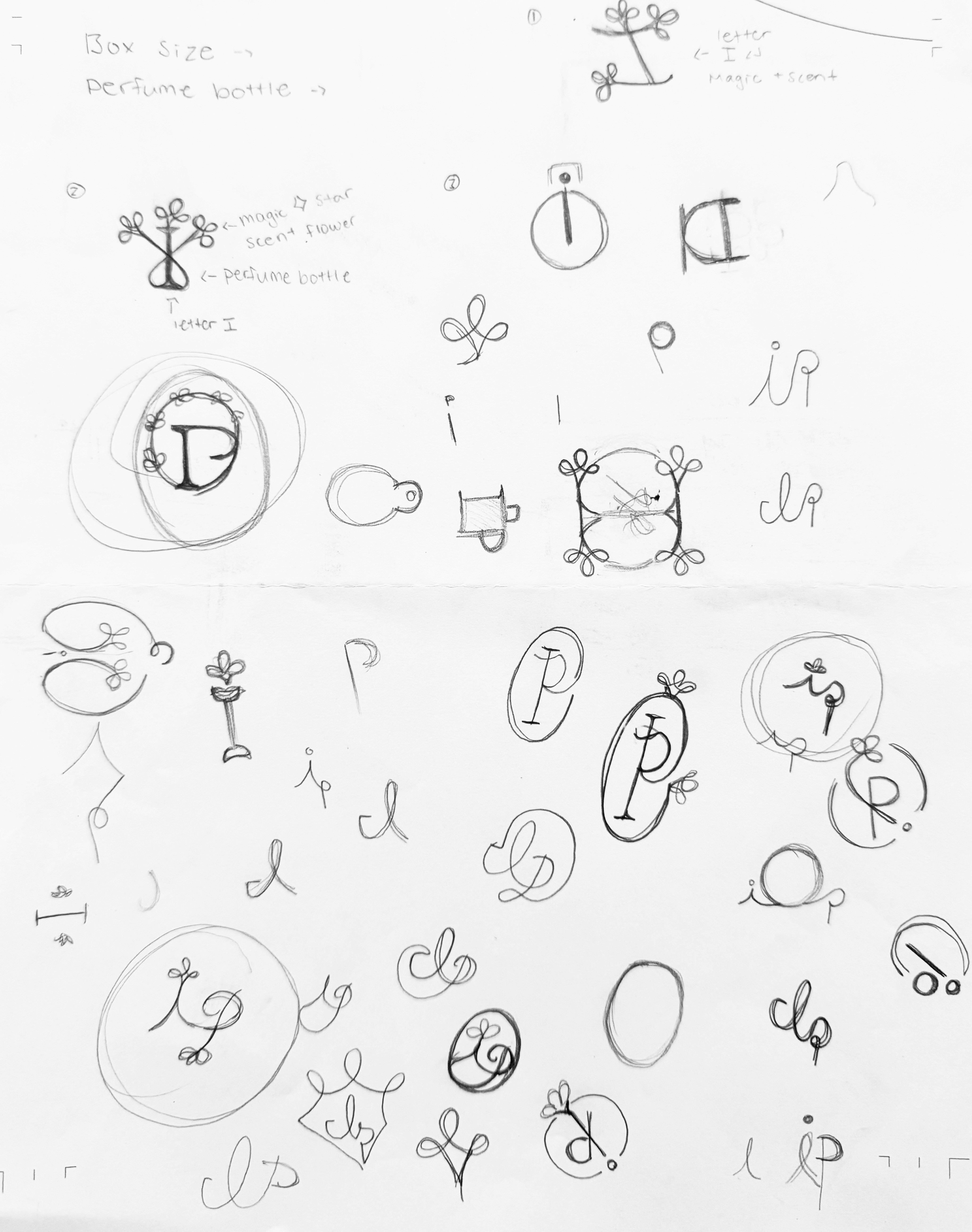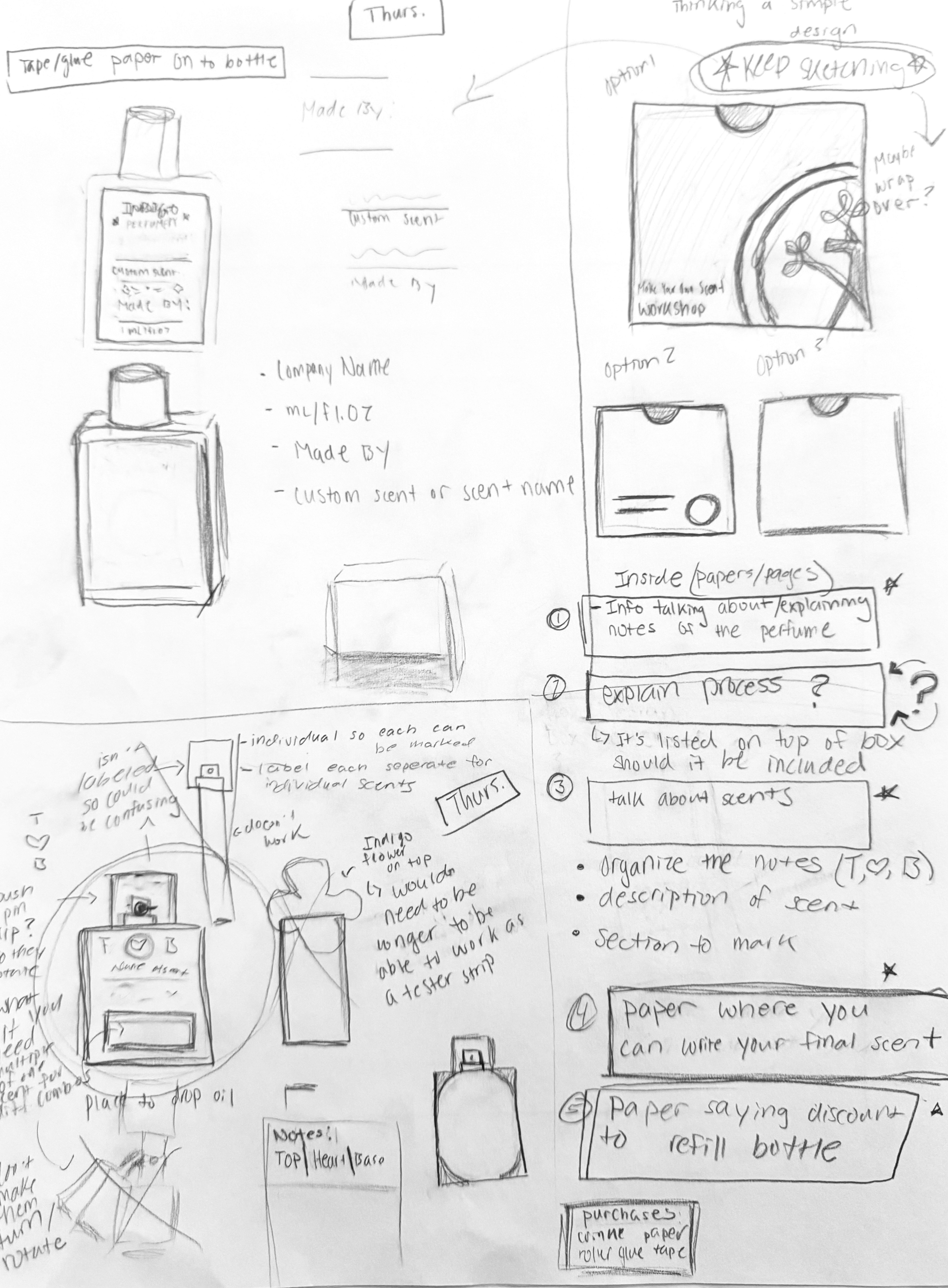 Sketched ideas for the perfume box packaging, label, testers, and the brochure holder.